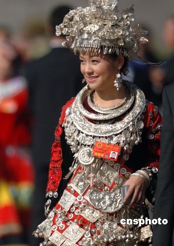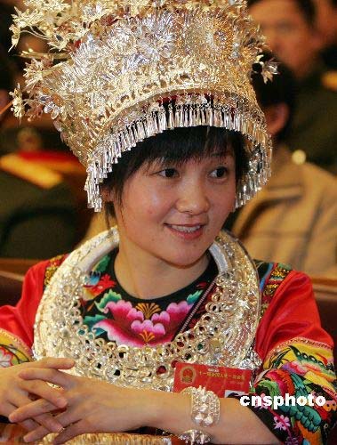 來(lái)自貴州的苗族全國(guó)人大代表雷阿幼朵,盛裝出席在北京人民大會(huì)堂舉行的十一屆全國(guó)人大一次會(huì)議預(yù)備會(huì)。中新社發(fā) 王東明 攝