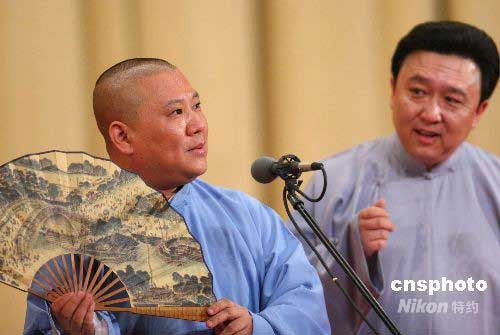 5月3日,紀念著名相聲大師侯寶林先生誕辰九十周年暨德云社相聲精品晚會,在北京人民大會堂舉行,當紅相聲演員郭德綱率領(lǐng)德云社成員侯震、于謙、何云偉、曹云金、李菁等為觀眾獻上了一場精彩的演出。全場所有段落都是在侯寶林先生原作的基礎(chǔ)上稍加修改而成,這其中包括了《賣布頭》、《戲曲與方言》、《歪批三國》等經(jīng)典段子。中新社發(fā) 富田 攝