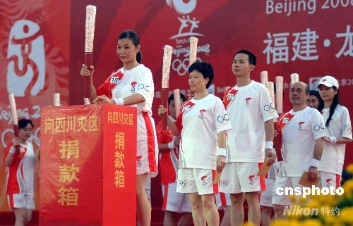 5月13日下午,北京奧運火炬在革命老區(qū)龍巖結(jié)束“紅色之旅”。圖為閉幕儀式上,來自福建的火炬手向四川地震災(zāi)區(qū)人民捐款。 中新社發(fā) 王東明 攝