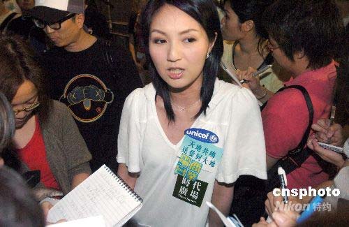 五月十六日晚,香港商業(yè)電臺(tái)在銅鑼灣時(shí)代廣場舉辦“天地共鳴送愛到大地”籌款活動(dòng),呼吁市民踴躍捐款,賑濟(jì)四川地震災(zāi)區(qū)。圖為香港歌星楊千嬅出席。中新社發(fā) 鄧慶樂 攝