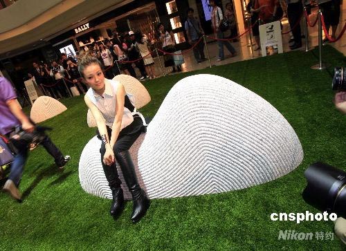 五月二十七日,臺(tái)灣藝術(shù)家洪東祿、黃致陽(yáng)藝術(shù)展在香港時(shí)代廣場(chǎng)舉行,香港歌星容祖兒被邀出席并在藝術(shù)家黃致陽(yáng)的“座千峰”雕塑前接受采訪。容祖兒介紹,明日就將與劉德華等數(shù)名藝人赴四川探訪地震災(zāi)民,給他們送去心靈的慰籍書(shū)藉。中新社發(fā) 王麗南 攝