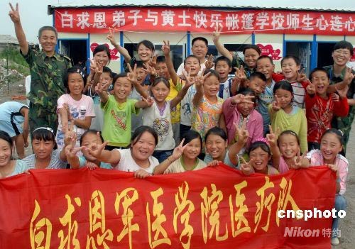 解放軍石家莊白求恩軍醫(yī)學(xué)院派出的心理支援隊,近日來到四川省安縣黃土鎮(zhèn)“快樂帳篷學(xué)!,向孩子履行心理支援義務(wù),收到良好效果。中新社發(fā) 尹威華 攝