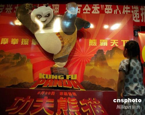 7月3日,北京一家影院《功夫熊貓》的海報吸引兒童。美國動畫片《功夫熊貓》在國內(nèi)上映后,票房勢如破竹,一路飄紅。截止到上周日,影片全國票房達到9688萬元,破億目標近在咫尺,已成為最賺錢的進口動畫片。中新社發(fā) 九州 攝