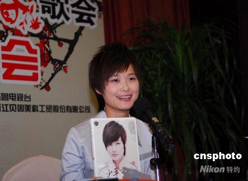 2008年7月13日,歌手李宇春做客山東,參加齊魯電視臺《粉絲大派送》,會見龐大的“玉米”歌迷,并為她的迷你新專輯《少年中國》做宣傳。中新社發(fā) 崔鵬森 攝