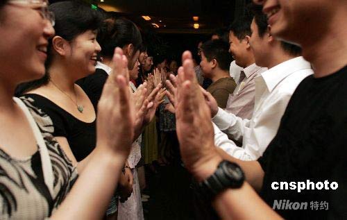7月19日,眾多北京青年在集體相親會(huì)上拍手互動(dòng),在活動(dòng)中尋找自己的愛情。參加此次活動(dòng)的單身青年大多來自某婚戀網(wǎng)站,很多參加相親活動(dòng)的年輕人表示,對(duì)于自己理想伴侶的要求更多的是希望相互性格、志向、情趣相投。借助婚戀網(wǎng)站平臺(tái)線上線下活動(dòng)去尋找物質(zhì)生活和精神生活完美統(tǒng)一的伴侶。就像徐志摩的詩,“我將在茫茫人海中尋訪我唯一之靈魂伴侶。得之,我幸;不得,我命!币晃粎⒓踊顒(dòng)的年輕人笑談,如果徐志摩生活在當(dāng)下,一定也會(huì)通過婚戀網(wǎng)找到自己“唯一之靈魂伴侶”的。中新社發(fā) 楊可佳 攝