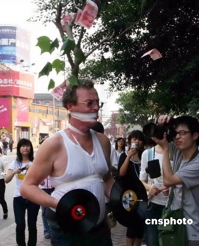 10月17日,來(lái)自法國(guó)、瑞典、荷蘭、日本、美國(guó)、新加坡及中國(guó)的20多位藝術(shù)家在重慶上演了一場(chǎng)行為藝術(shù)秀。圖為一荷蘭藝術(shù)家背著掛滿百元大鈔的樹丫,捆綁住自己走上街頭。中新社發(fā) 孟幻 攝