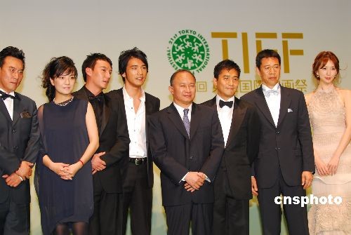 10月18日傍晚,第21屆東京國際電影節(jié)開幕。以“環(huán)!睘橹黝}的本屆電影節(jié)別出心裁地將星光大道的地毯由紅色改為綠色。上個月剛剛當(dāng)選日本首相的麻生太郎與開幕影片《赤壁》劇組成員同走綠地毯,成為第一個光臨東京國際電影節(jié)現(xiàn)場的日本總理大臣。圖為《赤壁》主創(chuàng)人員在電影節(jié)開幕式上亮相。中新社發(fā) 侯宇 攝