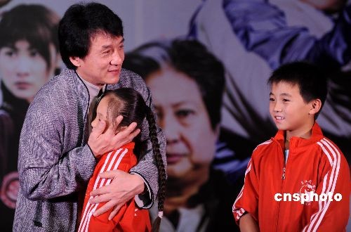 十月十八日,香港影星成龍愛撫電影《武術(shù)之少年行》中的小演員。當(dāng)日,該片在北京召開新聞發(fā)布會,洪金寶擔(dān)綱主演該片,成龍出任監(jiān)制。而該片主演劉峰超是全國劍術(shù)冠軍,王文杰也是一名新銳武打演員。該片影片將于十月二十四日在全國上映。中新社發(fā) 廖攀 攝