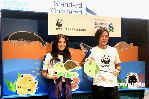 圖為海洋見證人鄭伊健和楊采妮在記者會上。