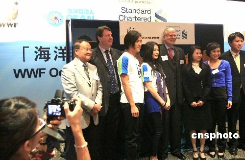 圖為世界自然基金會香港分會行政總裁龐毅理、渣打銀行(香港)有限公司香港區(qū)公共事務處主管廖碧瑩、海洋見證人鄭伊健及楊采妮等利用海洋生物(道具)砌出大型“海洋寶盒”并合影。