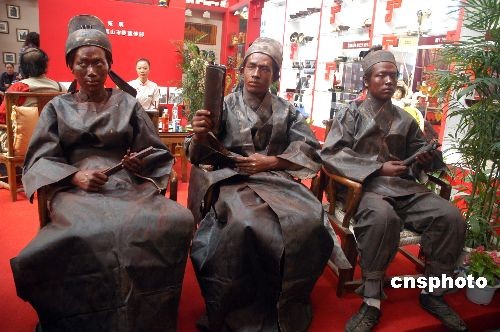 2008年11月16日,在武夷山第二屆海峽兩岸茶業(yè)博覽會上,三尊會動的雕塑吸引了眾多前來觀展的市民關(guān)注不少人紛紛拍照和“古人”合影留念。中新社發(fā) 張 斌 攝