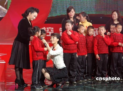 11月15日晚,中央電視臺演播廳錄制現(xiàn)場,正在進行迎接12月1日世界艾滋病宣傳日節(jié)目錄制。來自山西省臨汾市紅絲帶小學的12名孩子在老師帶領下,與預防艾滋病宣傳員彭麗媛、濮存昕一起參加節(jié)目錄制。彭麗媛、濮存昕對這些失去父母的孩子們的真切關愛,讓孩子們熱淚盈眶。中新社發(fā) 王輝耀 攝