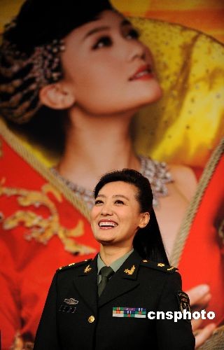 身穿軍裝的軍旅歌唱家譚晶在其盛裝演出照片前