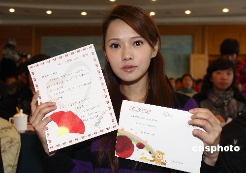 12月22日,愛心大使伊能靜在北京出席“新長城5·12災區(qū)學生新春關愛行動”啟動儀式,并在愛心賀卡上親手為四川災區(qū)小學生寫下新年祝福,這封賀卡將寄往映秀小學5年紀的賀華偉同學。參加活動的市民只需花費10元人民幣,就可為災區(qū)學生郵寄一枚新年愛心賀卡,其中還包含有為“自強獎學金”捐獻的善款。首批賀卡是寄給映秀小學學生的,他們將最先收到這份新年禮物。中新社發(fā) 杜洋 攝