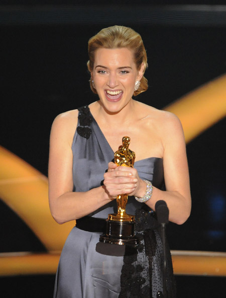 中新網(wǎng)2月23日電 美西時(shí)間2月22日下午17:00(北京時(shí)間2月23日上午9:00),第81屆奧斯卡金像獎(jiǎng)?lì)C獎(jiǎng)典禮在洛杉磯柯達(dá)劇院舉行,當(dāng)年在《泰坦尼克號(hào)》中飾演“露絲”一角而紅遍全球的女星凱特·溫斯萊特,今日第六次沖擊奧斯卡終于得償所愿。她憑借在《朗讀者》中的精湛演技而獲得第81屆奧斯卡最佳女主角,這位女星上臺(tái)領(lǐng)獎(jiǎng)激動(dòng)萬(wàn)分,她說(shuō)在八歲的時(shí)候曾經(jīng)想象這一時(shí)刻,當(dāng)時(shí)的獎(jiǎng)杯只是一個(gè)香檳杯子!拔乙兄x我的家人,所有人。我不能忘記你們。我很幸福,擁有一個(gè)愛我的丈夫和漂亮的孩子。”