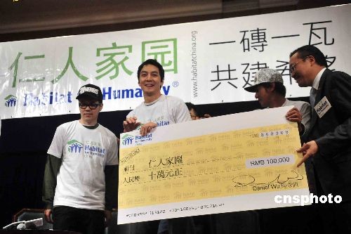 三月五日,香港演藝明星吳彥祖在仁人家園記者會(huì)上,捐款十萬(wàn)元人民幣,協(xié)助四川興建抗震房之用。中新社發(fā) 譚達(dá)明 攝