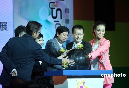 圖為香港特區(qū)商務(wù)及經(jīng)濟(jì)發(fā)展局長劉吳惠蘭、籌委會主席吳雨、音樂匯展大使譚詠麟、容祖兒等為活動主持開幕儀式。