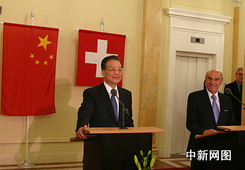 正在瑞士進(jìn)行正式訪問(wèn)的中國(guó)總理溫家寶,當(dāng)?shù)貢r(shí)間二十七日晚在伯爾尼與瑞士聯(lián)邦主席梅爾茨(右)舉行會(huì)談,并共同會(huì)見(jiàn)記者。雙方對(duì)會(huì)談成果給予積極評(píng)價(jià)。中新網(wǎng)記者 張朔 攝
