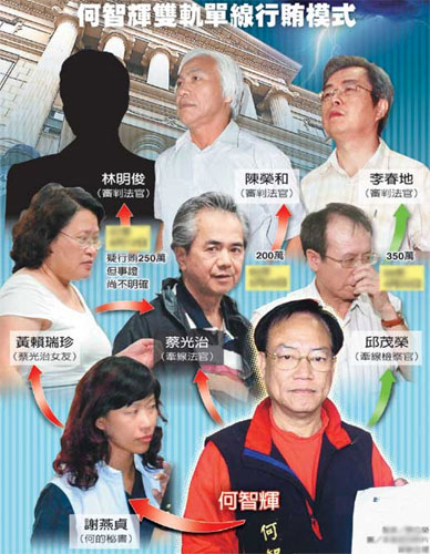 何智輝與高院法官蔡光治是多年好友,何智輝的秘書(shū)謝燕貞和蔡光治的女友黃賴(lài)瑞珍更是20多年前幼教工作的同事;板橋地檢署主任檢察官邱茂榮則因曾在苗栗地檢署做過(guò)主任檢察官,與當(dāng)過(guò)苗栗縣長(zhǎng)的何智輝早已熟識(shí)。何智輝于是運(yùn)用兩個(gè)女人當(dāng)中間人,再利用司法官之間同學(xué)、同事情誼,各自對(duì)承審法官行賄。