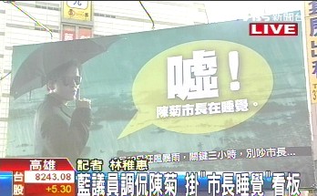 中新網(wǎng)10月1日電 據(jù)臺灣TVBS報道,高雄市長陳菊坦承在919風(fēng)災(zāi)當天下午,人在官邸休息,風(fēng)波持續(xù)延燒,藍營議員昨天(9月30日)下午在高雄市中心,掛上調(diào)侃陳菊市長的廣告牌,內(nèi)容是一名黑衣人回頭比“噓,市長在睡覺”,極盡調(diào)侃之能事。
