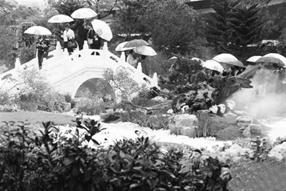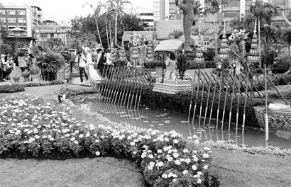 圓山公園展區(qū)戶外的大陸庭園內(nèi),只有緊挨在一起的上海和西安展區(qū)。上海展區(qū)內(nèi)有小橋流水,花草吐香,最為顯眼,且最能引起人們對(duì)舊上海歷史與文化回憶的設(shè)計(jì),則是由植栽構(gòu)成的石庫門建筑。