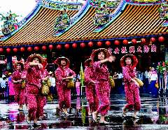 雖然下著大雨,但客家鄉(xiāng)親熱情依舊,個(gè)個(gè)打上客家花布領(lǐng)巾,組成客家味十足的踩街隊(duì)伍,由縣長(zhǎng)領(lǐng)軍,從冬山鄉(xiāng)街道開始踩街至大興振安宮。