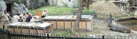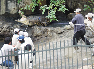 由于無人敢接近河口鱷,保育員采繩索硬拖拉法,八名保育大漢像拔河一般,將河口鱷硬拉進(jìn)長(zhǎng)鐵籠內(nèi)。隨后又以同樣模式,再硬拖重約一百三十公斤母鱷進(jìn)入另一鐵籠,以吊車先后安移入新居,與凱門鱷隔欄而居。