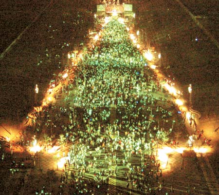 在臺(tái)灣省高雄市夢(mèng)時(shí)代廣場(chǎng)旁的時(shí)代大道上,一場(chǎng)“萬輪壓馬路、排棵圣誕樹”活動(dòng)正在舉行。只見五萬人騎自行車或踩直排輪游行后,在時(shí)代大道上聚集排出一棵長兩百米、寬八十米號(hào)稱世界最大的圣誕樹,場(chǎng)面相當(dāng)壯觀。臺(tái)灣《中國時(shí)報(bào)》圖