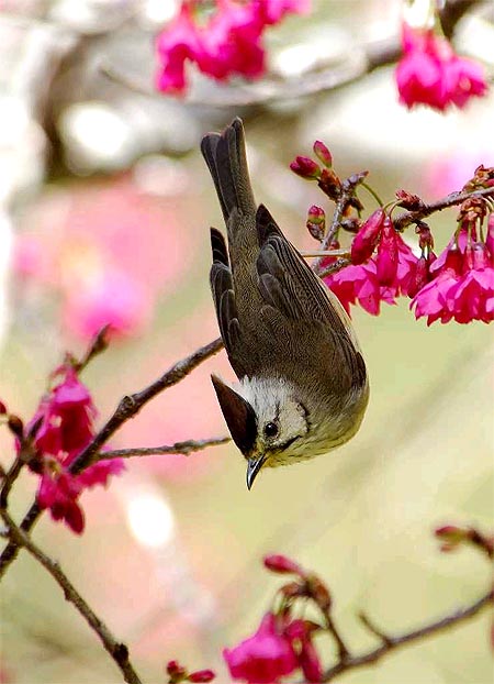 中新網1月2日電 據(jù)臺灣《中國時報》報道,冬季降遷的冠羽畫眉喜歡在盛開櫻花間覓食。圖為在臺灣省南投縣仁愛鄉(xiāng)正巧補捉到一只冠羽畫眉覓食的情況,搭配紅色的背景,像是洋溢著喜氣的年畫。(沈揮勝)