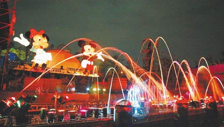一等主舞臺(tái)背景音樂響起,軌道兩側(cè)的米老鼠主燈,緩緩向舞臺(tái)中央靠攏,水舞與燈光迸射而出,在漆黑的夜空中令人驚艷,不少民眾為此歡呼連連,測(cè)試時(shí)間約十五分鐘。