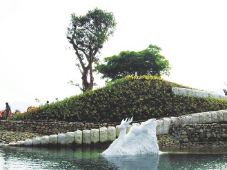 “邵族”人配合工程,協(xié)力規(guī)劃在潭北水域島旁,依“邵族”先人追逐白鹿到水邊的傳奇故事,設(shè)置雕塑白鹿一只,刻意半浮在水中,讓游客聯(lián)想當(dāng)年“邵族”人追隨白鹿神話故事,希望增添此島的神秘性。