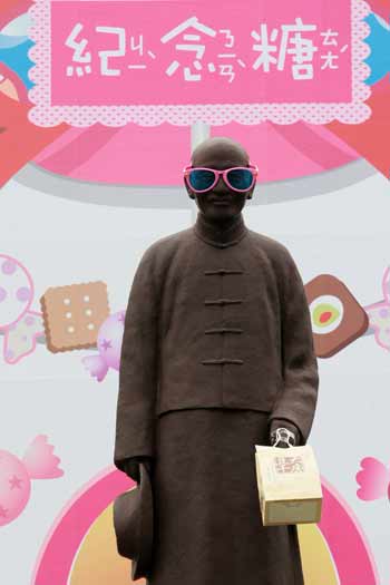 中新網(wǎng)4月10日電 據(jù)“中央社”報(bào)道,臺灣師范大學(xué)“糖果屋”裝置藝術(shù)展演活動(dòng)10日在臺師大校園舉行記者會,有人把矗立在校園內(nèi)的蔣介石銅像載上大眼鏡變成介紹美食的“紀(jì)念糖糖主”,但卻引來一位老伯伯表達(dá)不同看法,認(rèn)為這樣“不尊重的蔣公”。