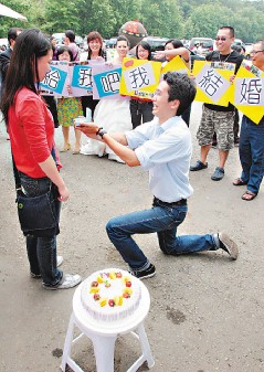 據(jù)臺(tái)灣《聯(lián)合報(bào)》報(bào)道,60對(duì)新人昨天齊聚蔣介石銅像園區(qū)參加“穿越時(shí)空遇到愛(ài)”集體結(jié)婚典禮。新人們牽手步過(guò)鵲橋進(jìn)入會(huì)場(chǎng),個(gè)個(gè)拼創(chuàng)意,有舉牌助婚團(tuán),還有頂著爆炸頭的新郎倌,連穿自由車車裝新人都搶著亮相,讓園區(qū)里頭喜氣洋洋。