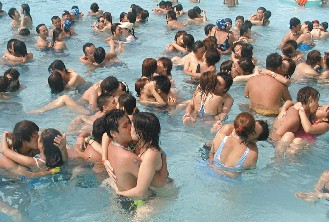 中新網(wǎng)7月30日電 臺北縣八里鄉(xiāng)八仙水上樂園4年前舉辦“愛的啵啵”七夕情人節(jié)活動,吸引百余對情侶在水中忘情擁吻。今年8月7日“七夕”要挑戰(zhàn)更高難度,舉辦“水底接吻競賽”,第一名可獲得水中數(shù)碼相機(jī)1臺。