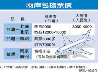 東南旅行社經(jīng)理黃國軒表示,由于各家航空公司直航包機(jī)的起降時(shí)間還未最后敲定,若排在好時(shí)段,也會比一般時(shí)段票價(jià)高出五百至八百元。