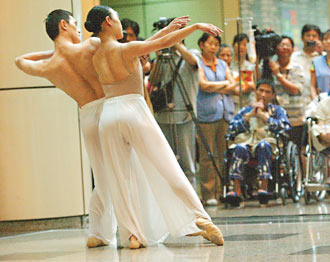 云門舞集成立已經(jīng)三十五周年,在全臺(tái)十九家醫(yī)院推出“醫(yī)院里的春天”巡演,把舞臺(tái)搬到醫(yī)院。臺(tái)大醫(yī)院昨天過113周年生日,云門舞者帶來“水月”的精華片段,沒有另外搭舞臺(tái),沒有燈光,在樸實(shí)的醫(yī)院大廳上演最真實(shí)的感動(dòng),駐足的觀眾把舞者團(tuán)團(tuán)圍住,還有病人坐著輪椅觀賞。