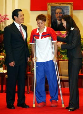 馬英九接見(jiàn)中華臺(tái)北奧運(yùn)代表團(tuán),與受傷的跆拳道選手蘇麗文(中)合影。(“中央社”圖)