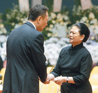 郭臺(tái)銘24日上午前往臺(tái)塑創(chuàng)辦人王永慶靈堂吊唁,并向三娘李寶珠(右)致意。(圖片來源:臺(tái)灣《聯(lián)合晚報(bào)》)