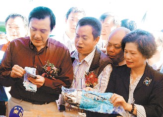 馬英九23日到宜蘭縣參加鯖魚節(jié)活動(dòng),當(dāng)場(chǎng)掏出一迭鈔票,數(shù)了兩萬(wàn)元買魚松、鹽漬鯖魚等產(chǎn)品,希望民眾也多消費(fèi)。圖片來(lái)源:臺(tái)灣《聯(lián)合報(bào)》