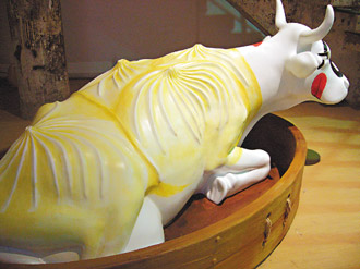 臺灣的奔牛節(jié)開放創(chuàng)作現(xiàn)場(華山創(chuàng)意園區(qū)),最近每隔一段時(shí)間,現(xiàn)場就會換上一批花色不同的牛,有時(shí)還可看到正在創(chuàng)作的藝術(shù)家,如莊普現(xiàn)正創(chuàng)作“三只鹿”,讓牛披上了梅花鹿的皮,就有點(diǎn)“指牛為鹿”的味道。洪天宇的牛,內(nèi)臟器官全部外露。