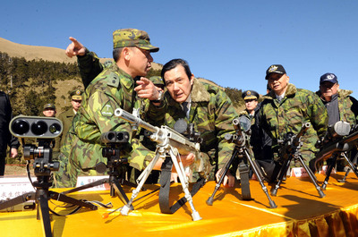 馬英九14日前往合歡山武嶺視察臺(tái)灣陸軍特訓(xùn)中心武嶺寒訓(xùn)基地,慰問受訓(xùn)士兵并參觀特訓(xùn)中心各式雪地狙擊所使用的特殊裝備。