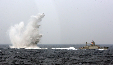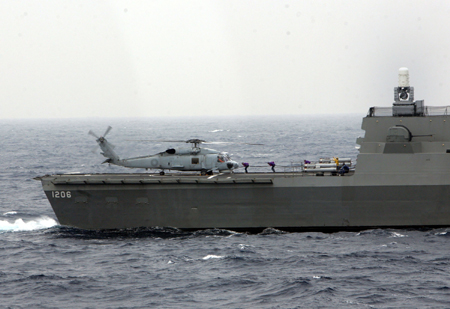 臺灣海軍今天在高雄左營基地舉行春節(jié)戒備操演,重點加強反潛艇演習,動員了大小總共十六艘各式艦艇與反潛機,執(zhí)行包括反快艇作戰(zhàn)、緊急攻潛、海空協(xié)同反潛及空中戰(zhàn)力整補,過程相當逼真。“中央社”圖 張皓安 攝