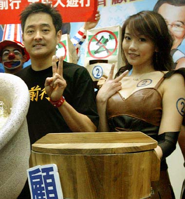 國(guó)民黨的全民大游行活動(dòng)訊息現(xiàn)場(chǎng)邀請(qǐng)模特兒展示游行大隊(duì)的主題;民進(jìn)黨的活動(dòng)上參加活動(dòng)年輕人在臉上寫(xiě)“勝”字挺謝長(zhǎng)廷。
