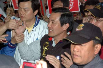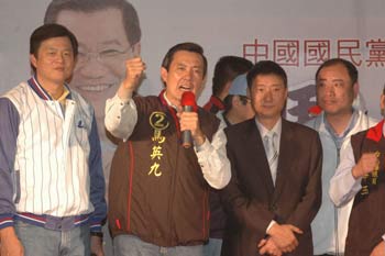 國(guó)民黨候選人馬英九(左二)21日在臺(tái)北縣掃街前表示,因?yàn)檫x民手中的一票,決定臺(tái)灣的未來。一向挺綠的坪林鄉(xiāng)長(zhǎng)王潮清(右二)也在馬英九見證下加入國(guó)民黨,讓藍(lán)營(yíng)士氣大振。