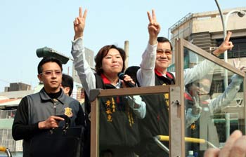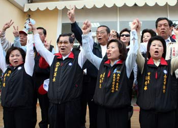 國民黨“副總統(tǒng)”候選人蕭萬長(右一)21日上午回故鄉(xiāng)嘉義市進(jìn)行車隊掃街拜票,呼吁鄉(xiāng)親要“家己人要挺嘉義人”,讓馬蕭過關(guān)。