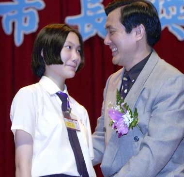 2001年,時(shí)為臺(tái)北市長的馬英九頒發(fā)市長獎(jiǎng)給各“國中”優(yōu)秀畢業(yè)生,當(dāng)頒發(fā)給自己的小女兒馬元中時(shí)樂得將他拉進(jìn)自己的懷里擁抱,但馬元中顯得羞澀不自然,甚至白了父親一眼。(臺(tái)灣聯(lián)合新聞網(wǎng)圖;潘俊宏/攝影)