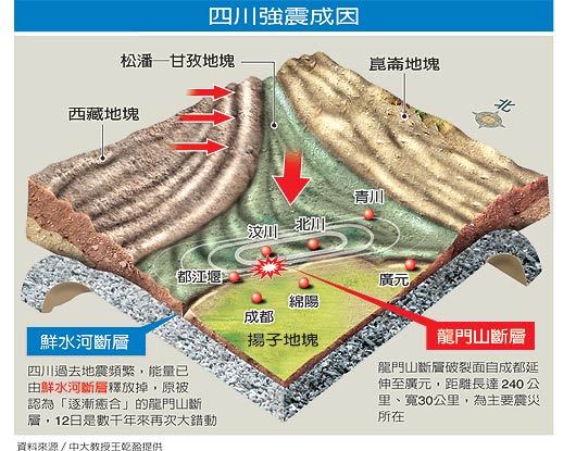 王乾盈說,四川過去百年來發(fā)生的大小地震,只有少數(shù)跟龍門山斷層有關(guān),規(guī)模不大,“以前長時(shí)間地震釋放的能量,幾乎都被同在四川的鮮水河斷層消耗掉”,地震專家都以為龍門山斷層的傷口愈合了,不可能再動(dòng)了。