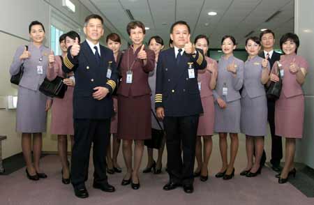 兩岸周末包機(jī)四日啟動(dòng),首班桃園至上海的華航包機(jī),機(jī)組員在登機(jī)門(mén)前豎大姆指,象征“飛航第一、飛安第一”。