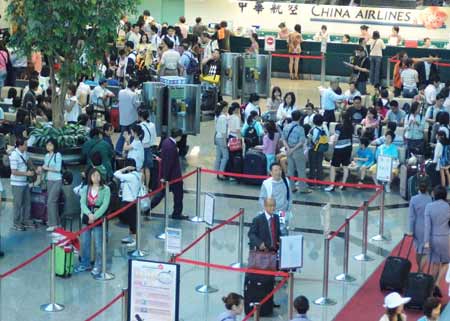 兩岸周末包機(jī)首航,華航四日分別有兩班機(jī)飛往大陸,柜臺(tái)一早擠滿旅客,滿帶期待參與首航。 “中央社”圖