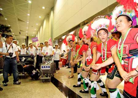 兩岸周末包機啟動,大陸來臺觀光首發(fā)團四日抵達桃園機場后,受到南投縣少數(shù)民族的載歌載舞歡迎,也成為觀光客目光焦點!爸醒肷纭眻D
